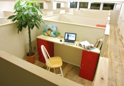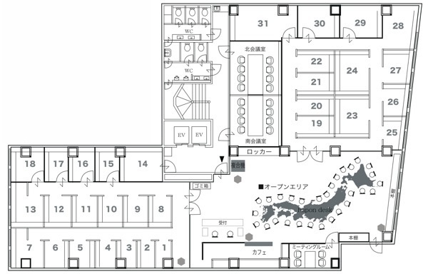 オープンエリアのHAPONデスク日本海側に位置するブースエリアを、